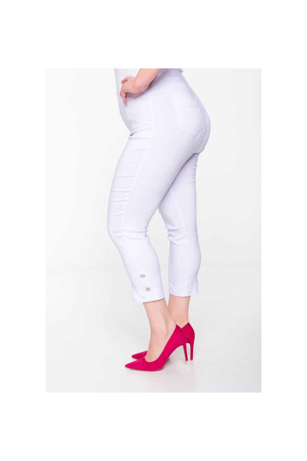 Pohodlné nohavice s širokým pásom a dĺžkou 7/8. Vyrobené z veľmi elastického, tenkého materiálu bengalín, s prednými falošnými vreckami, zadnými nášitkovými vreckami, bočným rozparkom na nohaviciach a ozdobnými gombami.